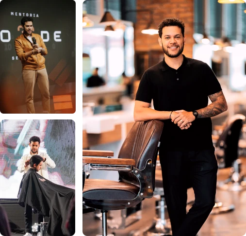 Hoje, lidero uma barbearia com 13 pessoas que funciona completamente sem a minha presença. Também sou educador no Business e Code X, ensinando barbeiros e empresários a alcançar o próximo nível.